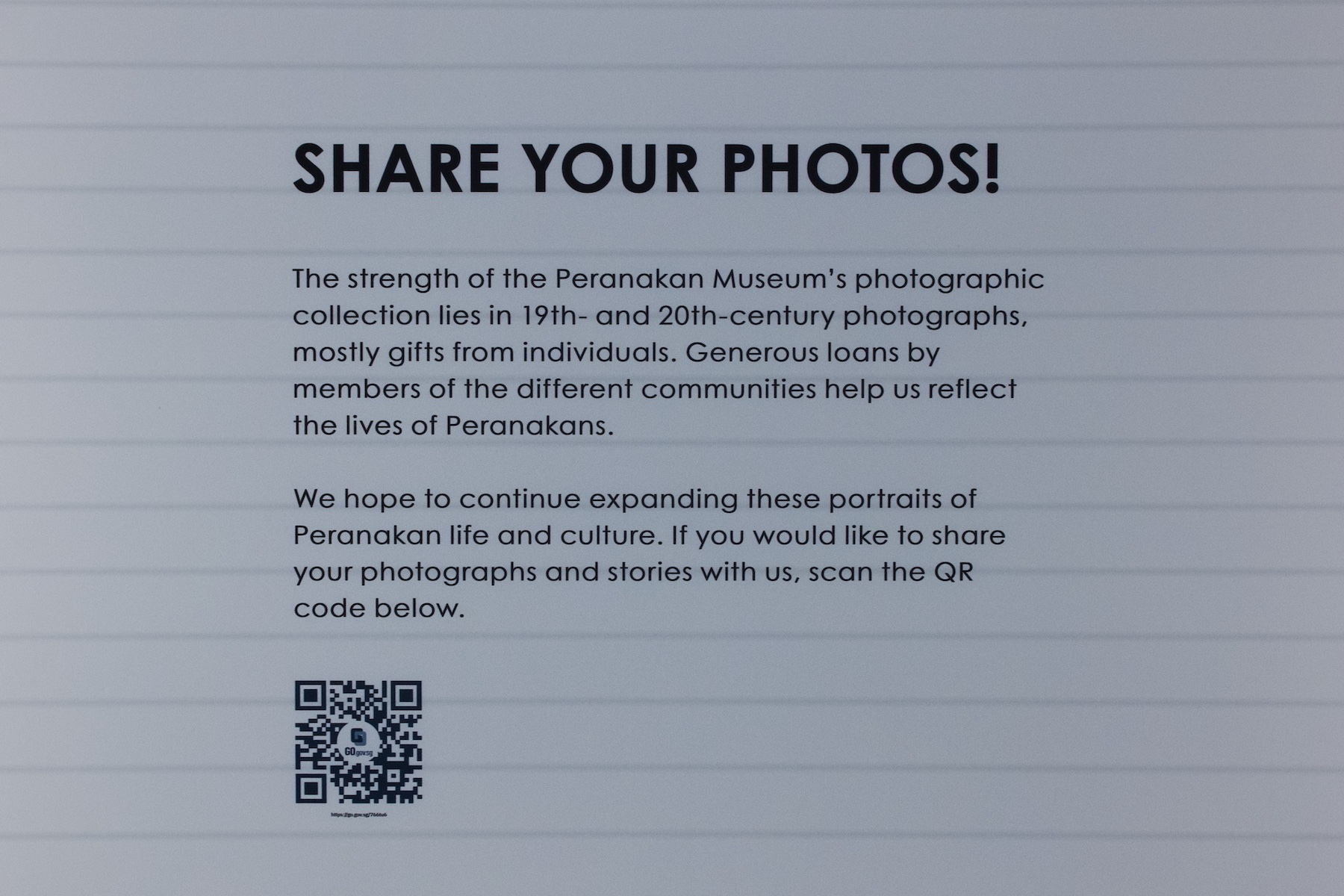 Vous y rencontrerez des portraits de Peranakans du passé, coloriés à la main, ainsi que des portraits et interviews de Peranakans d’aujourd’hui qui partagent leurs pensées et réflexions sur ce que Peranakan signifie pour eux. Ce travail collaboratif continue en invitant les visiteurs à partager leurs photos de famille s’ils en ont qui peuvent enrichir la collection.