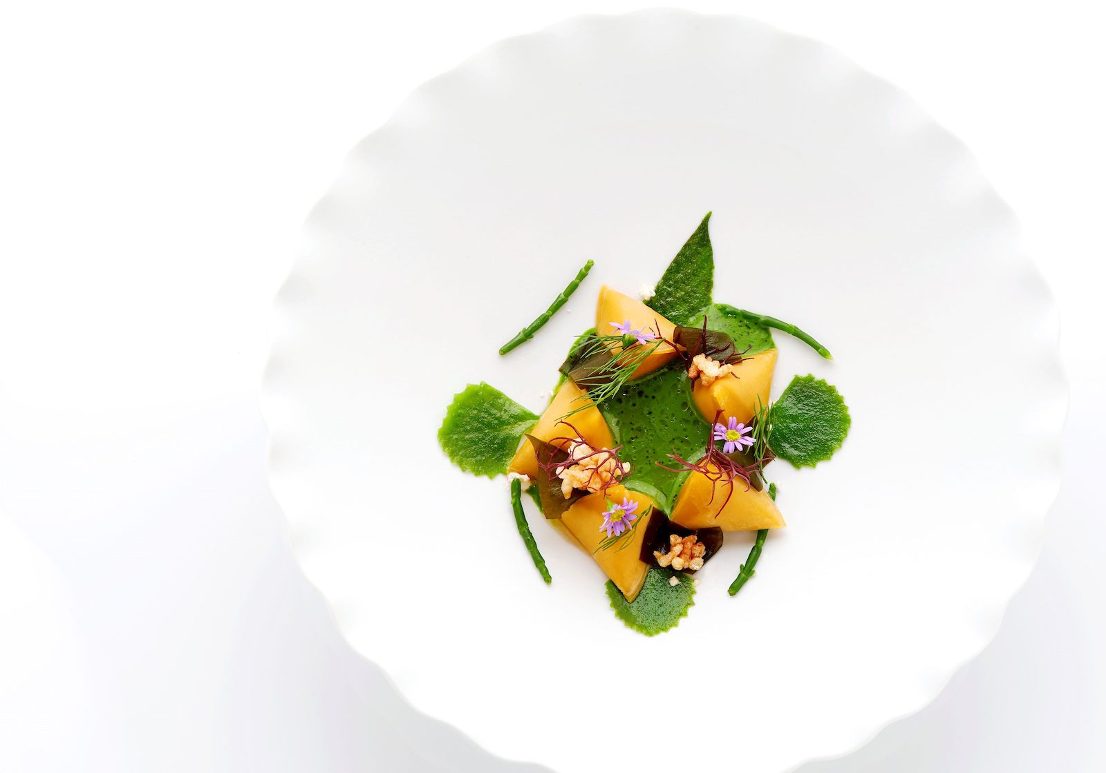 Exemple de cette réinvention dans la continuité, les fameux berlingot pyramidaux, emblèmes de la maison Pic. Pour leur version la plus récente, chef Francesco s’est inspiré des saveurs du Nusantara. Son berlingot “Laksa” à base de crabe, huile de coco, citronnelle, galangal, ail et échalotes, repose sur un coulis composé d’herbes et, une évidence, feuilles de laksa.